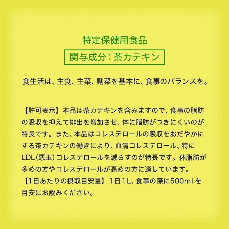 許可表示:本品は茶カテキンを含みますので、食事の脂肪の吸収を抑えて排出を増加させ、体に脂肪がつきにくいのが特長です。また、本品はコレステロールの吸収をおだやかにする茶カテキンの働きにより、血清コレステロール、特にLDL(悪玉)コレステロールを減らすのが特長です。体脂肪が多めの方やコレステロールが高めの方に適しています。