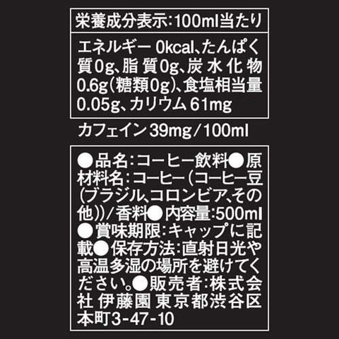 | 100ml当たり エネルギー:0kcal、たんぱく質:0g、脂質:0g、炭水化物:0.6g(糖類:0g)、食塩相当量:0.05g、カリウム:61mg、カフェイン:39mg |