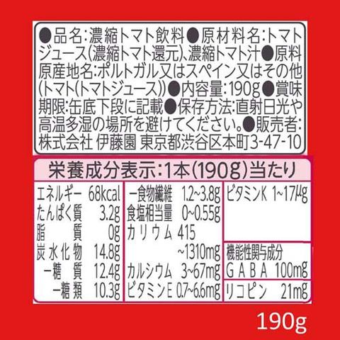 | 1本(190g)当たり エネルギー:68kcal、たんぱく質:3.2g、脂質:0g、炭水化物:14.8g(糖質:12.4g(糖類:10.3g)、食物繊維:1.2g~3.8g)、食塩相当量:0~0.55g、カリウム:415~1310mg、カルシウム:3~67mg、ビタミンE:0.7~6.6mg、ビタミンK:1~17μg 機能性関与成分 GABA:100mg リコピン:21mg ※砂糖、食塩は一切使用していません。糖類、食塩相当量は主にトマトに由来するものです。 |