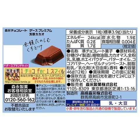 | 砂糖(タイ製造)、植物油脂、カカオマス、全粉乳、乳糖、ホエイパウダー、バターオイル、ココアバター、ヘーゼルナッツペースト、脱脂粉乳/乳化剤(大豆由来)、香料 |