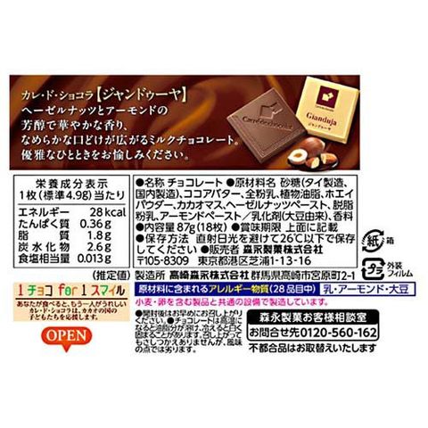 | 砂糖(タイ製造、国内製造)、ココアバター、全粉乳、植物油脂、ホエイパウダー、カカオマス、ヘーゼルナッツペースト、脱脂粉乳、アーモンドペースト/乳化剤(大豆由来)、香料 |