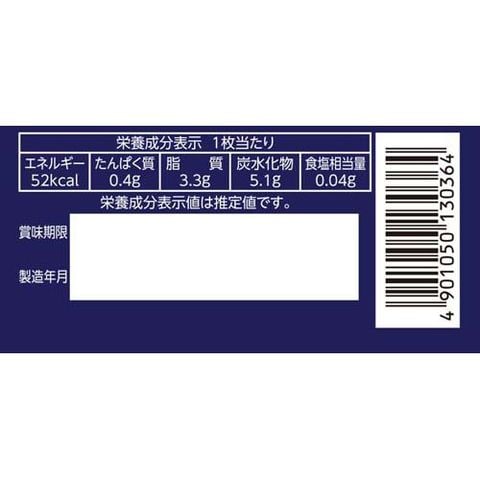 | 1枚当たり エネルギー:52kcal、たんぱく質:0.4g、脂質:3.3g、炭水化物:5.1g、食塩相当量:0.04g |