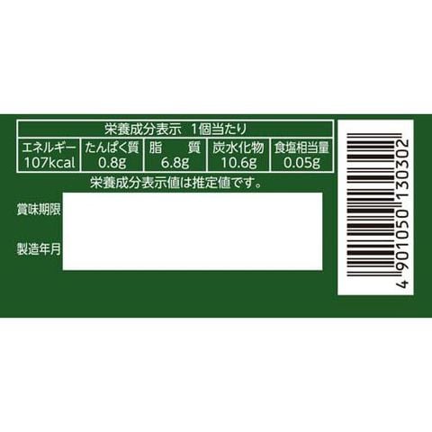 | 1個当たり エネルギー:107kcal、たんぱく質:0.8g、脂質:6.8g、炭水化物:10.6g、食塩相当量:0.05g |