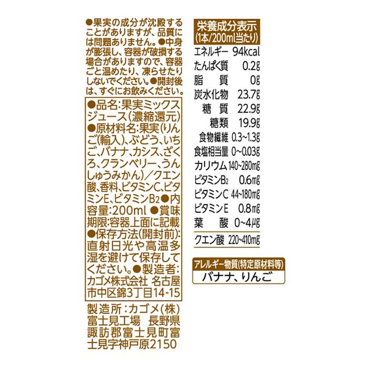 | 1本(200ml)当たり エネルギー:94kcal、たんぱく質:0.2g、脂質:0g、炭水化物:23.7g(糖質:22.9g、糖類:19.9g、食物繊維:0.3-1.3g)、食塩相当量:0-0.03g、カリウム:140-280mg、ビタミンB2:0.6mg、ビタミンC:44-180mg、ビタミンE:0.8mg、葉酸:0-4μg、クエン酸:220-410mg |