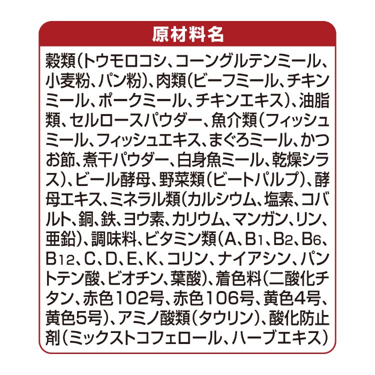 | 穀類(トウモロコシ、コーングルテンミール、小麦粉、パン粉)、肉類(ビーフミール、チキンミール、ポークミール、チキンエキス)、油脂類、セルロースパウダー、魚介類(フィッシュミール、フィッシュエキス、まぐろミール、かつお節、煮干パウダー、白身魚ミール、乾燥シラス)、ビール酵母、野菜類(ビートパルプ)、酵母エキス、ミネラル類(カルシウム、塩素、コバルト、銅、鉄、ヨウ素、カリウム、マンガン、リン、亜鉛)、調味料、ビタミン類(A、B1、B2、B6、B12、C、D、E、K、コリン、ナイアシン、パントテン酸、ビオチン、葉酸)、着色料(二酸化チタン、赤色102号、赤色106号、黄色4号、黄色5号)、アミノ酸類(タウリン)、酸化防止剤(ミックストコフェロール、ハーブエキス) |