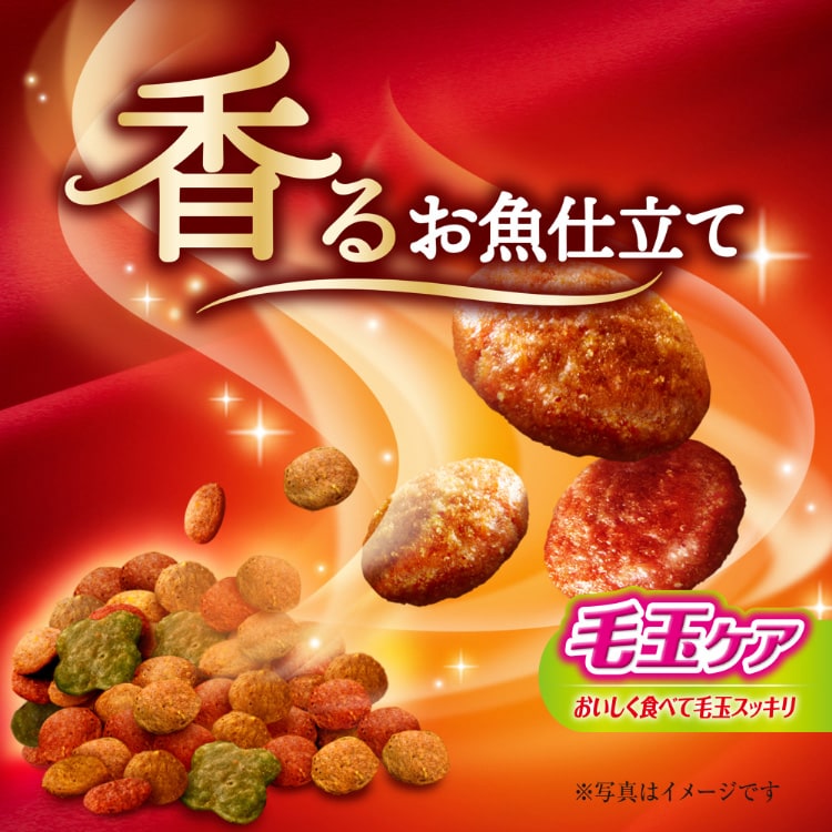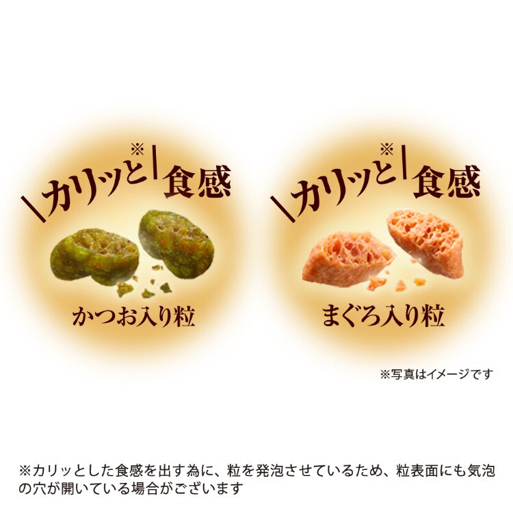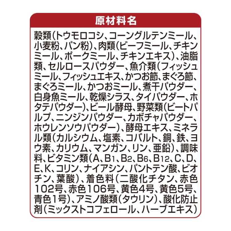 穀類(トウモロコシ、コーングルテンミール、小麦粉、パン粉)、肉類(ビーフミール、チキンミール、ポークミール、チキンエキス)、油脂類、セルロースパウダー、魚介類(フィッシュミール、フィッシュエキス、かつお節、まぐろ節、まぐろミール、かつおミール、煮干パウダー、白身魚ミール、乾燥シラス、タイパウダー、ホタテパウダー)、ビール酵母、野菜類(ビートパルプ、ニンジンパウダー、カボチャパウダー、ホウレンソウパウダー)、酵母エキス、ミネラル類(カルシウム、塩素、コバルト、銅、鉄、ヨウ素、カリウム、マンガン、リン、亜鉛)、調味料、ビタミン類(A、B1、B2、B6、B12、C、D、E、K、コリン、ナイアシン、パントテン酸、ビオチン、葉酸)、着色料(二酸化チタン、赤色102号、赤色106号、黄色4号、黄色5号、青色1号)、アミノ酸類(タウリン)、酸化防止剤(ミックストコフェロール、ハーブエキス)