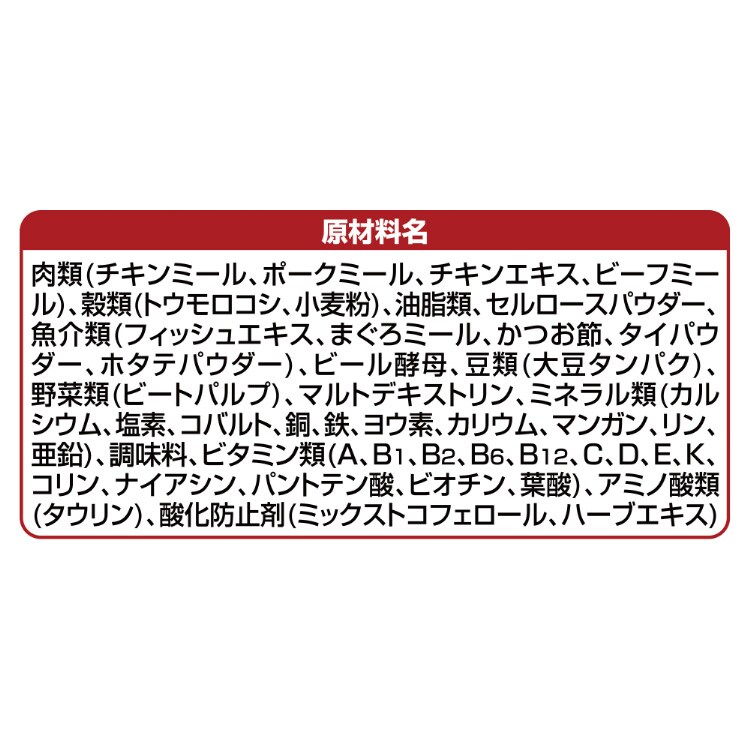 | 肉類(チキンミール、ポークミール、チキンエキス、ビーフミール)、穀類(トウモロコシ、小麦粉)、油脂類、セルロースパウダー、魚介類(フィッシュエキス、まぐろミール、かつお節、タイパウダー、ホタテパウダー)、ビール酵母、豆類(大豆タンパク)、野菜類(ビートパルプ)、マルトデキストリン、ミネラル類(カルシウム、塩素、コバルト、銅、鉄、ヨウ素、カリウム、マンガン、リン、亜鉛)、調味料、ビタミン類(A、B1、B2、B6、B12、C、D、E、K、コリン、ナイアシン、パントテン酸、ビオチン、葉酸)、アミノ酸類(タウリン)、酸化防止剤(ミックストコフェロール、ハーブエキス) |