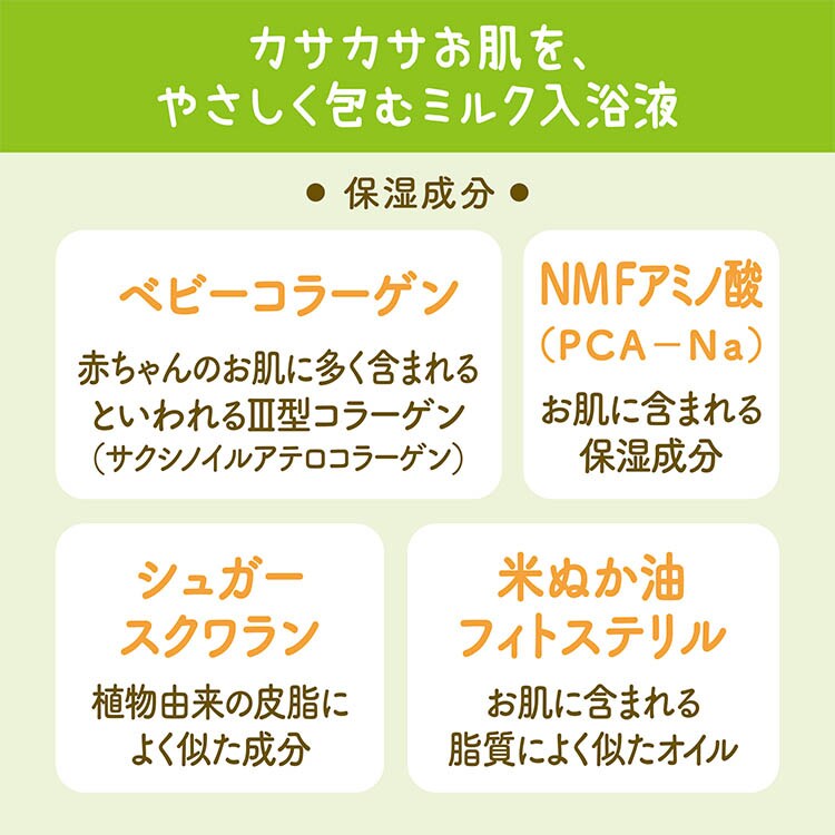 ●カサカサお肌をミルク入浴液がやさしく包み、しっとり、つるんと潤います