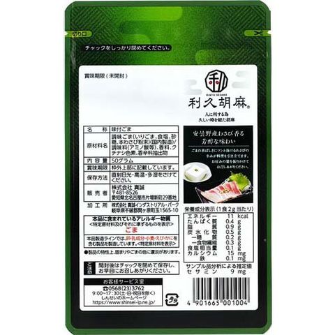 | 1食(2g)当たり エネルギー:11kcal、たんぱく質:0.4g、脂質:0.9g、炭水化物:0.5g(糖質:0.2g、食物繊維:0.3g)、食塩相当量:0.1g、カルシウム:15mg、鉄:0.1mg セサミン:9mg |