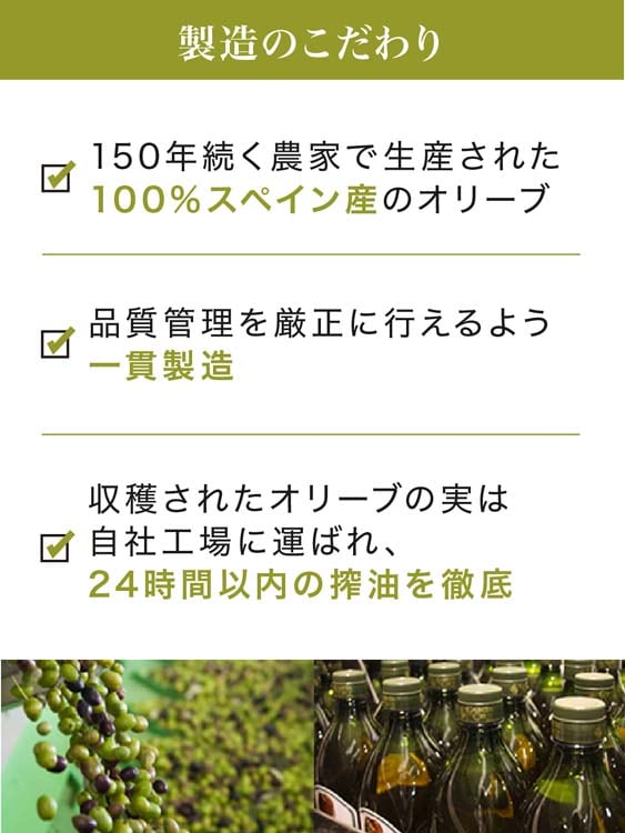 ●スペイン産オリーブのみを使用した、エクストラバージンオリーブオイルです。スペインの代表的な品種であるピクアル種・オヒブランカ種・コルニカブラ種をメインにブレンドしています