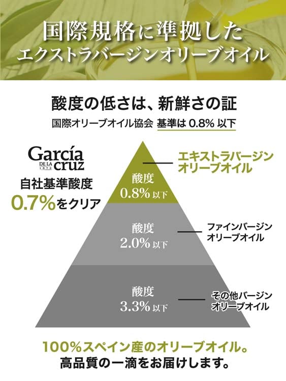 ●国際オリーブオイル協会(IOC)により規定されているエキストラバージンオリーブオイルの規格である酸度0.8%以下に対し、自社基準として酸度0.7%以下に設定。