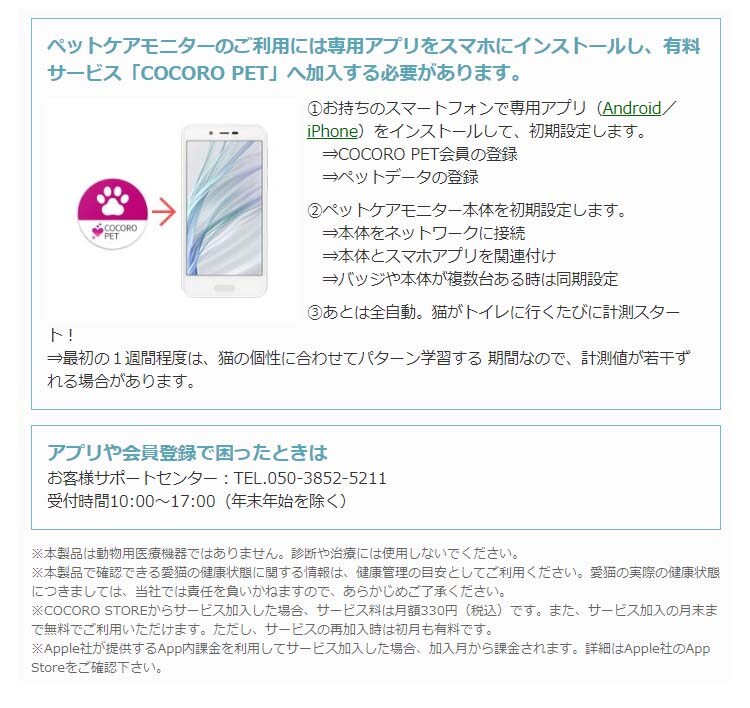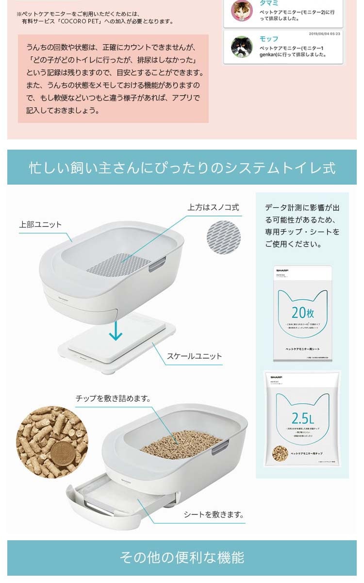 | ・素材:ポリオレフィン不織布、吸収紙、高分子吸収材、綿状パルプ、ポリエチレン、ホットメルト接着剤 ・サイズ(外寸):約430mm*約290mm ・容量:20枚 ・使用期間の目安:愛猫1匹の場合:1枚で約3日~4日間/愛猫2匹の場合:1枚で約1日~2日間 |