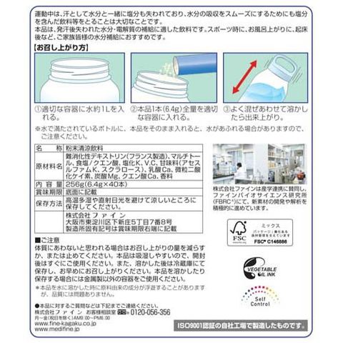 難消化性デキストリン(フランス製造)、マルチトール、食塩/クエン酸、塩化K、V.C、甘味料(アセスルファムK、スクラロース)、乳酸Ca、微粒二酸化ケイ素、炭酸Mg、クエン酸Ca、香料