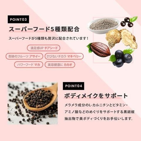 ●大豆たんぱくに11種類のビタミンと不足しがちな4種類のミネラル、5種類のスーパーフード、さらに、L-カルニチンと黒胡椒抽出物を配合したプロテインです。