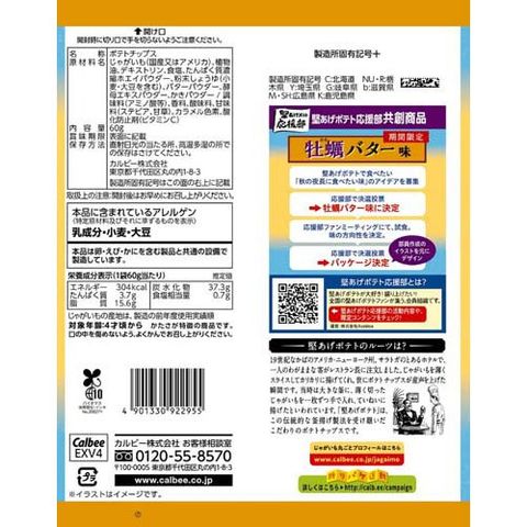 | じゃがいも(国産又はアメリカ)、植物油、デキストリン、食塩、たんぱく質濃縮ホエイパウダー、粉末しょうゆ(小麦・大豆を含む)、バターパウダー、酵母エキスパウダー、かきパウダー / 調味料(アミノ酸等)、香料、酸味料、甘味料(ステビア、甘草)、カラメル色素、酸化防止剤(ビタミンC) |