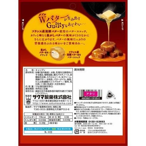 | 砂糖(国内製造)、水飴、乳等を主要原料とする食品、植物油脂、還元パラチノース、砂糖結合水飴、カラメルソース、生クリーム、発酵バター、全粉乳、バターオイル、食塩、たん白質濃縮ホエイパウダー/香料、乳化剤、(一部に乳成分・大豆を含む) |