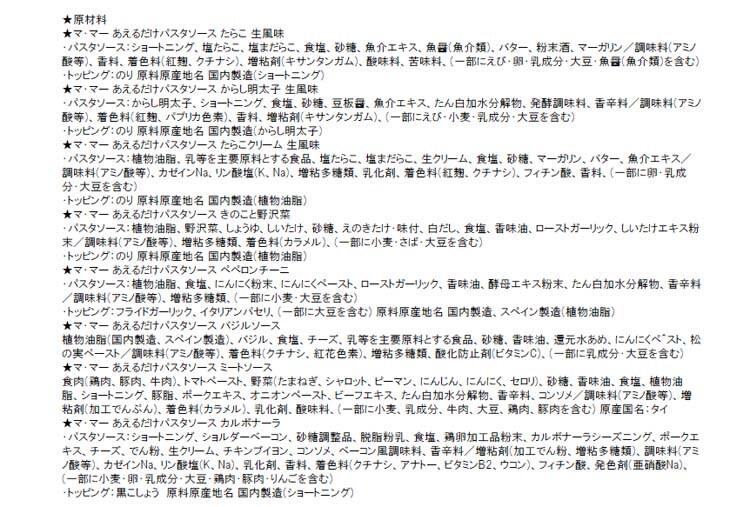★マ・マー あえるだけパスタソース カルボナーラ:小麦・卵・乳成分・大豆・鶏肉・豚肉・りんご