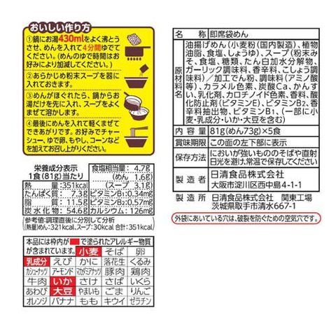 | 油揚げめん(小麦粉(国内製造)、植物油脂、食塩、しょうゆ)、スープ(粉末みそ、食塩、糖類、たん白加水分解物、ガーリック調味料、香辛料、こしょう調味料)/加工でん粉、調味料(アミノ酸等)、カラメル色素、炭酸Ca、かんすい、乳化剤、カロチノイド色素、香料、酸化防止剤(ビタミンE)、ビタミンB2、香辛料抽出物、ビタミンB1、(一部に小麦・乳成分・いか・大豆を含む) |