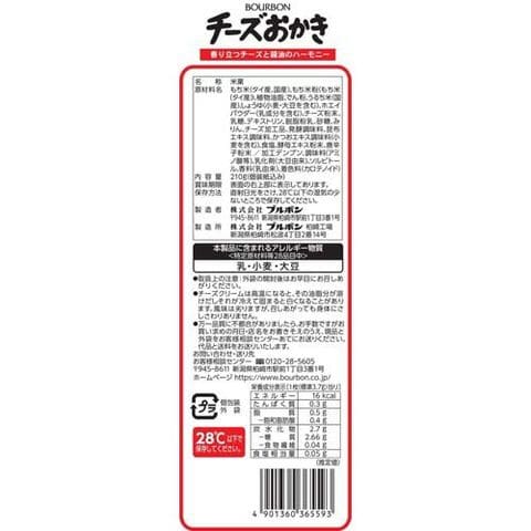もち米(タイ産、国産)、もち米粉(もち米(タイ産))、植物油脂、でん粉、うるち米(国産)、しょうゆ(小麦・大豆を含む)、ホエイパウダー(乳成分を含む)、チーズ粉末、乳糖、デキストリン、脱脂粉乳、砂糖、みりん、チーズ加工品、発酵調味料、昆布エキス調味料、かつおエキス調味料(小麦を含む)、食塩、酵母エキス粉末、唐辛子粉末/加工デンプン、調味料(アミノ酸等)、乳化剤(大豆由来)、ソルビトール、香料(乳由来)、着色料(カロテノイド)