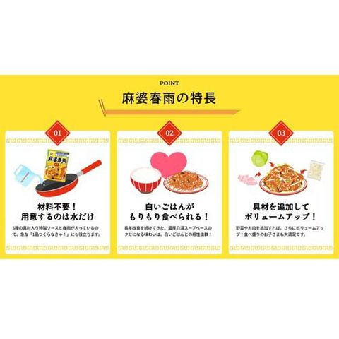 | 麻婆ソース(糖類混合品(水あめ、砂糖、ぶどう糖果糖液糖)、ポークエキス、植物油脂、醤油、きくらげ、たけのこ、食塩、豚肉、砂糖、人参、赤ピーマン、大豆たん白、豆板醤、にんにく、生姜、オイスターソース、花椒、唐辛子、香味油/調味料(アミノ酸等)、糊料(加工でん粉)、カラメル色素、カロチノイド色素、香辛料、酸化防止剤(ビタミンE)、(一部に小麦・ごま・大豆・鶏肉・豚肉を含む))、春雨(でん粉/乳酸)(中国製造) |