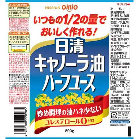 | 大さじ1杯(14g)当たり 熱量:126kcal、たんぱく質:0g、脂質:14g、飽和脂肪酸:1g、コレステロール:0mg、炭水化物:0g、食塩相当量:0g |