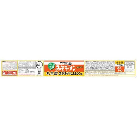 | 油揚げめん(小麦粉(国内製造)、植物油脂、でん粉、食塩、油脂加工品、みそ、砂糖)、スープ(食塩、みそ、香辛料、砂糖、ポーク調味料、油脂加工品、ねぎ、野菜調味料、発酵調味料、植物油脂、酵母エキス、香味油、たん白加水分解物)、かやく(フライドガーリック)/加工でん粉、調味料(アミノ酸等)、カラメル色素、炭酸カルシウム、乳化剤、かんすい、香辛料抽出物、クチナシ色素、酸化防止剤(ビタミンE)、酸味料、ビタミンB2、ビタミンB1、香料、(一部に小麦・乳成分・ごま・大豆・鶏肉・豚肉を含む) |