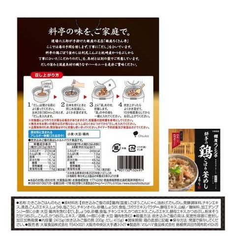 | 炊き込みご飯の具:鶏肉(国産)、ごぼう、こんにゃく、油あげ、でんぷん、発酵調味料、チキンエキス、清酒、こんぶエキス、しょうゆ、塩こうじ、チキンオイル、砂糖、しょうが、食塩、ゴボウエキスパウダー、酵母エキス、山椒/酸味料、加工デンプン、(一部に小麦・大豆・鶏肉を含む) だし:しょうゆ、砂糖、食塩、チキンエキス、かつおエキス、こんぶエキス、酵母エキス、かつおぶし、粉末そうだかつおぶし、こんぶ、かつおぶしエキス/酒精、(一部に小麦・大豆・鶏肉を含む) |