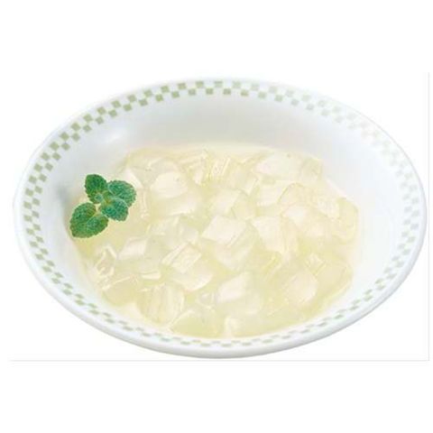 ●アロエベラの肉厚で透明な葉肉部分を約2cmのキューブ状にカットし、ライトシラップでほどよい甘さに仕上げました。