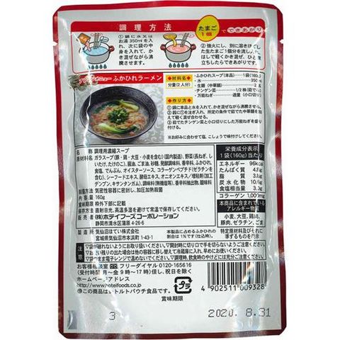 | 1袋(160g)当たり エネルギー96kcal たんぱく質4.8g 脂質3.8g 炭水化物10.6g 食塩相当量3.0g コラーゲン1、000mg |