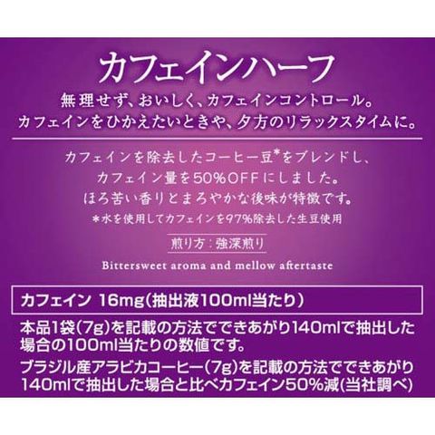 ●カフェインを除去したコーヒー豆をブレンドすることで、カフェイン量を50%OFFにしました。ほろ苦い香りとまろやかな後味が特徴です。