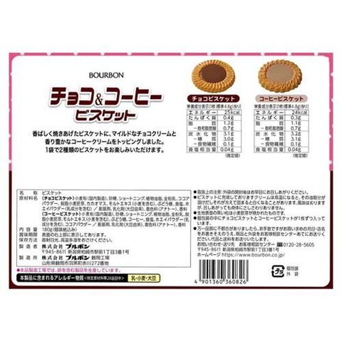 | ★チョコビスケット:小麦粉(国内製造)、砂糖、ショートニング、植物油脂、全粉乳、ココアパウダー、脱脂小麦胚芽、カカオマス、モルトエキス(小麦を含む)、ぶどう糖、食塩、ホエイパウダー(乳成分を含む)/膨脹剤、乳化剤(大豆由来)、着色料(アナトー)、香料 ★コーヒービスケット:小麦粉(国内製造)、砂糖、ショートニング、植物油脂、全粉乳、脱脂小麦胚芽、モルトエキス(小麦を含む)、ぶどう糖、コーヒー、食塩、ホエイパウダー(乳成分を含む)、ココアパウダー/膨脹剤、乳化剤(大豆由来)、着色料(アナトー)、香料 |