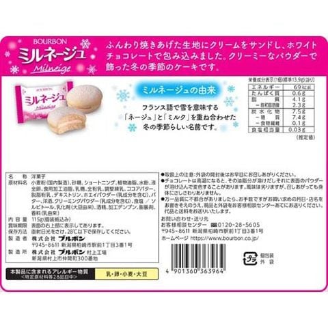 | 小麦粉(国内製造)、砂糖、ショートニング、植物油脂、水飴、液全卵、食用加工油脂、乳糖、全粉乳、調整練乳、ココアバター、脱脂粉乳、デキストリン、ホエイパウダー(乳成分を含む)、バター、洋酒、クリ―ミングパウダー(乳成分を含む)、食塩/ソルビトール、乳化剤(大豆由来)、酒精、加工デンプン、膨脹剤、香料(乳由来) |