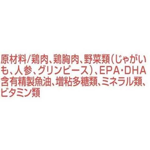 | 鶏肉、鶏胸肉、野菜類(じゃがいも、人参、グリンピース)、EPA・DHA含有精製魚油、増粘多糖類、ミネラル類、ビタミン類 |