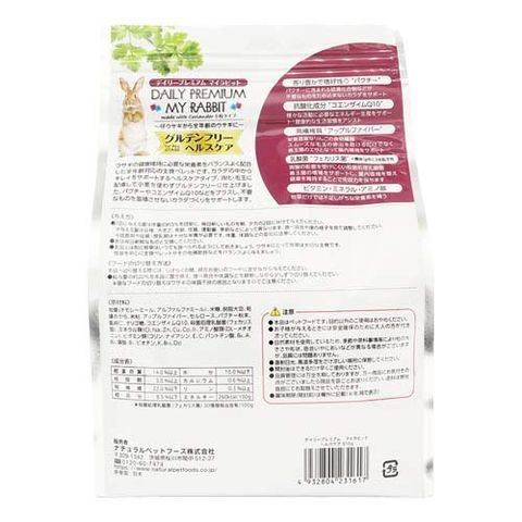 | 牧草(チモシーミール、アルファルファミール)、米糠、脱脂大豆、乾燥おから、米粉、アップルファイバー、セルロース、パクチー粉末、亜麻仁、オリゴ糖、コエンザイム Q10、殺菌処理乳酸菌(フェカリス菌)、ミネラル類(Cl、Na、Zn、Cu、Co、I)、アミノ酸類(DL-メチオニン)、ビタミン類(コリン、ナイアシン、E、C、パントテン酸、B6、A、B2、葉酸、B1、ビオチン、K、B12、D3) |