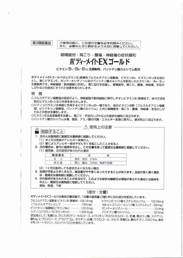 | ボディメイトEXゴールドは黄色の糖衣錠で、1日最大服用量(3錠)中に次の成分を配合しています。 フルスルチアミン塩酸塩(ビタミンB1誘導体):109.16mg(フルスルチアミンとして100mg) ピリドキシン塩酸塩(ビタミンB6):100.0mg シアノコバラミン(ビタミンB12):1500.0μg ビタミンEコハク酸エステルカルシウム:103.58mg(dl-α-トコフェロールコハク酸エステルとして100mg) ガンマーオリザノール:10.0mg パントテン酸カルシウム:30.0mg 添加物として、乳酸Ca、クロスポビドン、セルロース、ヒドロキシプロピルセルロース、乳糖、無水ケイ酸、ステアリン酸Mg、ヒプロメロース、アラビアゴム、ゼラチン、白糖、マクロゴール、タルク、炭酸Ca、酸化チタン、CMC-Na、黄色4号(タートラジン)、カルナウバロウを含有しています。 |