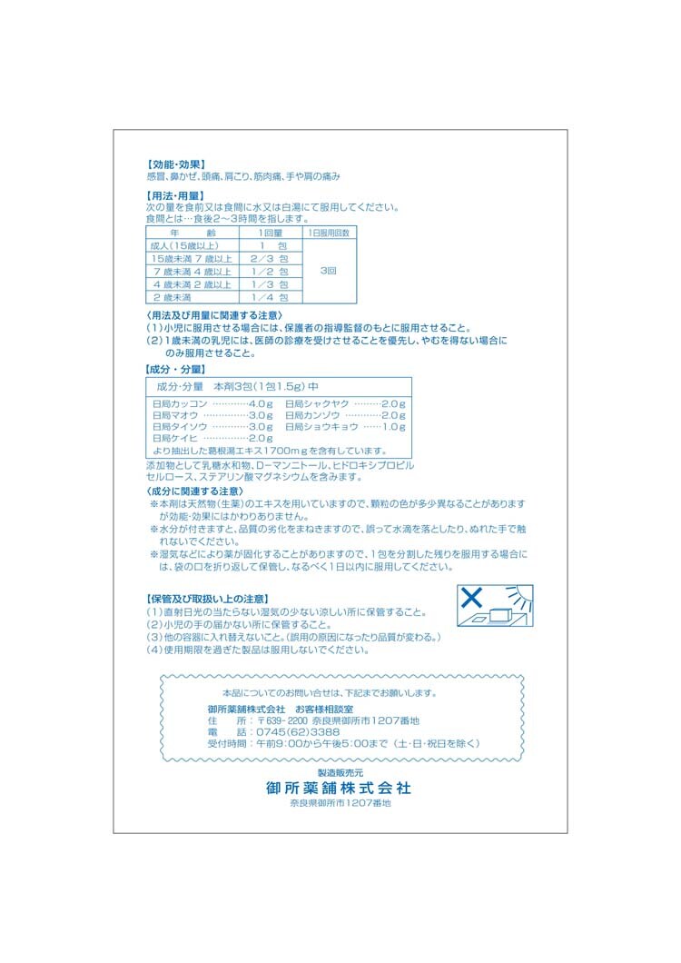 | 本剤3包(1包1.5g)中 日局カッコン:4.0g 日局マオウ:3.0g 日局タイソウ:3.0g 日局ケイヒ:2.0g 日局シャクヤク:2.0g 日局カンゾウ:2.0g 日局ショウキョウ:1.0g より抽出した葛根湯エキス1700mgを含有しています。 添加物として乳糖水和物、D-マンニトール、ヒドロキシプロピルセルロース、ステアリン酸マグネシウムを含みます。 ★成分に関する注意 ※本剤は天然物(生薬)のエキスを用いていますので、顆粒の色が多少異なることがありますが効能・効果にはかわりありません。 ※水分が付きますと、品質の劣化を招きますので、誤って水滴を落としたり、ぬれた手で触れないでください。 ※湿気などにより薬が固化することがありますので、1包を分割した残りを服用する場合には、袋の口を折り返して保管し、なるべく1日以内に服用してください。 |
