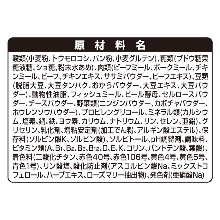 穀類(小麦粉、トウモロコシ、パン粉、小麦グルテン)、糖類(ブドウ糖果糖液糖、ショ糖、粉末水あめ)、肉類(ビーフミール、ポークミール、チキンミール、ビーフ、チキンエキス、ササミパウダー、ビーフエキス)、豆類(脱脂大豆、大豆タンパク、おからパウダー、大豆エキス、大豆パウダー)、動物性油脂、フィッシュミール、ビール酵母、セルロースパウダー、チーズパウダー、野菜類(ニンジンパウダー、カボチャパウダー、ホウレンソウパウダー)、プロピレングリコール、ミネラル類(カルシウム、塩素、銅、鉄、ヨウ素、カリウム、ナトリウム、リン、セレン、亜鉛)、グリセリン、乳化剤、増粘安定剤(加工でん粉、アルギン酸エステル)、保存料(ソルビン酸K、ソルビン酸)、ソルビトール、pH調整剤、調味料、ビタミン類(A、B1、B2、B6、B12、D、E、K、コリン、パントテン酸、葉酸)、着色料(二酸化チタン、赤色40号、赤色106号、黄色4号、黄色5号、青色1号)、リン酸塩、酸化防止剤(アスコルビン酸Na、ミックストコフェロール、ハーブエキス、ローズマリー抽出物)、発色剤(亜硝酸Na)