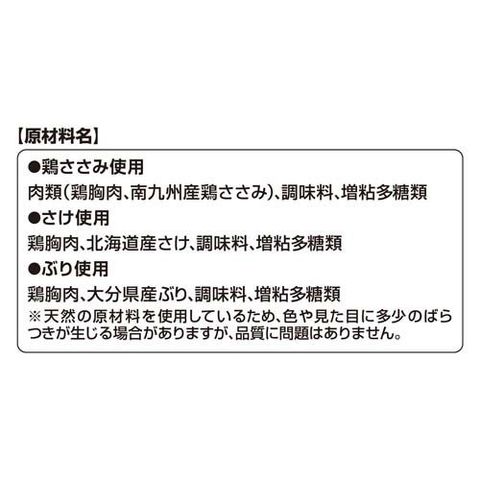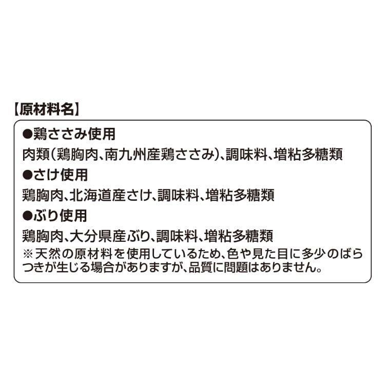 | ★鶏ささみ使用:肉類(鶏胸肉、南九州産鶏ささみ)、調味料、増粘多糖類 ★さけ使用:鶏胸肉、北海道産さけ、調味料、増粘多糖類 ★ぶり使用:鶏胸肉、大分県産ぶり、調味料、増粘多糖類※天然の原材料を使用しているため、色や見た目に多少のばらつきが生じる場合がありますが、品質に問題はありません。 |