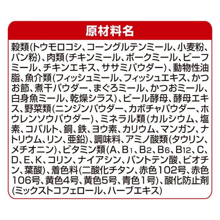 | 穀類(トウモロコシ、コーングルテンミール、小麦粉、パン粉)、肉類(チキンミール、ポークミール、ビーフミール、チキンエキス、ササミパウダー)、動物性油脂、魚介類(フィッシュミール、フィッシュエキス、かつお節、煮干パウダー、まぐろミール、かつおミール、白身魚ミール、乾燥シラス)、ビール酵母、酵母エキス、野菜類(ニンジンパウダー、カボチャパウダー、ホウレンソウパウダー)、ミネラル類(カルシウム、塩素、コバルト、銅、鉄、ヨウ素、カリウム、マンガン、ナトリウム、リン、亜鉛)、調味料、アミノ酸類(タウリン、メチオニン)、ビタミン類(A、B1、B2、B6、B12、C、D、E、K、コリン、ナイアシン、パントテン酸、ビオチン、葉酸)、着色料(二酸化チタン、赤色102号、赤色106号、黄色4号、黄色5号、青色1号)、酸化防止剤(ミックストコフェロール、ハーブエキス) |