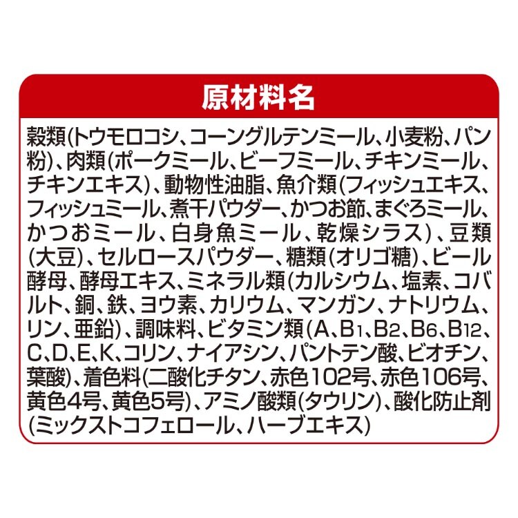 | 穀類(トウモロコシ、コーングルテンミール、小麦粉、パン粉)、肉類(ポークミール、ビーフミール、チキンミール、チキンエキス)、動物性油脂、魚介類(フィッシュエキス、フィッシュミール、煮干パウダー、かつお節、まぐろミール、かつおミール、白身魚ミール、乾燥シラス)、豆類(大豆)、セルロースパウダー、糖類(オリゴ糖)、ビール酵母、酵母エキス、ミネラル類(カルシウム、塩素、コバルト、銅、鉄、ヨウ素、カリウム、マンガン、リン、亜鉛)、ビタミン類(A、B1、B2、B6、B12、C、D、E、K、コリン、ナイアシン、パントテン酸、ビオチン、葉酸)、アミノ酸類(タウリン、メチオニン)、着色料(二酸化チタン、赤色102号、赤色106号、黄色4号、黄色5号)、調味料、酸化防止剤(ミックストコフェロール、ハーブエキス) |
