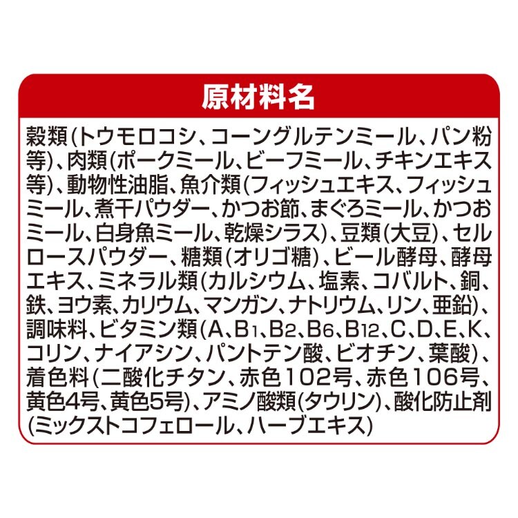 | 穀類(トウモロコシ、コーングルテンミール、パン粉等)、肉類(ポークミール、ビーフミール、チキンエキス等)、動物性油脂、魚介類(フィッシュエキス、フィッシュミール、煮干パウダー、かつお節、まぐろミール、かつおミール、白身魚ミール、乾燥シラス)、豆類(大豆)、セルロースパウダー、糖類(オリゴ糖)、ビール酵母、酵母エキス、ミネラル類(カルシウム、塩素、コバルト、銅、鉄、ヨウ素、カリウム、マンガン、ナトリウム、リン、亜鉛)、調味料、ビタミン類(A、B1、B2、B6、B12、C、D、E、K、コリン、ナイアシン、パントテン酸、ビオチン、葉酸)、着色料(二酸化チタン、赤色102号、赤色106号、黄色4号、黄色5号)、アミノ酸類(タウリン)、酸化防止剤(ミックストコフェロール、ハーブエキス) |