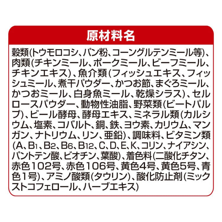 | 穀類(トウモロコシ、パン粉、コーングルテンミール等)、肉類(チキンミール、ポークミール、ビーフミール、チキンエキス)、魚介類(フィッシュエキス、フィッシュミール、煮干パウダー、かつお節、まぐろミール、かつおミール、白身魚ミール、乾燥シラス)、セルロースパウダー、動物性油脂、野菜類(ビートパルプ)、ビール酵母、酵母エキス、ミネラル類(カルシウム、塩素、コバルト、銅、鉄、ヨウ素、カリウム、マンガン、ナトリウム、リン、亜鉛)、調味料、ビタミン類(A、B1、B2、B6、B12、C、D、E、K、コリン、ナイアシン、パントテン酸、ビオチン、葉酸)、着色料(二酸化チタン、赤色102号、赤色106号、黄色4号、黄色5号、青色1号)、アミノ酸類(タウリン)、酸化防止剤(ミックストコフェロール、ハーブエキス) |