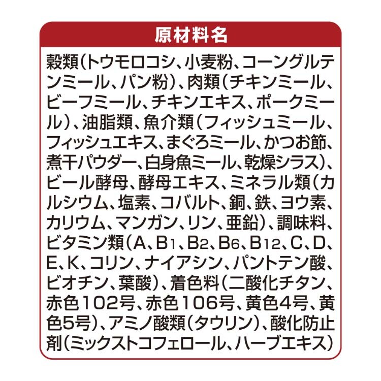 | 穀類(トウモロコシ、小麦粉、コーングルテンミール、パン粉)、肉類(ビーフミール、チキンミール、ポークミール、チキンエキス)、油脂類、魚介類(フィッシュエキス、フィッシュミール、まぐろミール、かつお節、煮干パウダー、白身魚ミール、乾燥シラス)、ビール酵母、酵母エキス、ミネラル類(カルシウム、塩素、コバルト、銅、鉄、ヨウ素、カリウム、マンガン、リン、亜鉛)、調味料、ビタミン類(A、B1、B2、B6、B12、C、D、E、K、コリン、ナイアシン、パントテン酸、ビオチン、葉酸)、着色料(二酸化チタン、赤色102号、赤色106号、黄色4号、黄色5号)、アミノ酸類(タウリン)、酸化防止剤(ミックストコフェロール、ハーブエキス) |