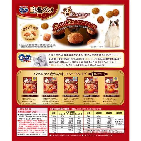 | タンバク質:30.0%以上、脂質:16.0%以上、粗繊維:3.0%以下、粗灰分:8.0%以下、水分:10.0%以下、カロリー:約400kcal/100gあたり |