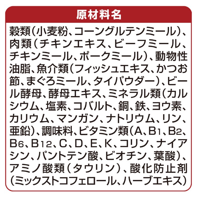 | 穀類(小麦粉、コーングルテンミール)、肉類(チキンエキス、ビーフミール、チキンミール、ポークミール)、動物性油脂、魚介類(フィッシュエキス、かつお節、まぐろミール、タイパウダー)、ビール酵母、酵母エキス、ミネラル類(カルシウム、塩素、コバルト、銅、鉄、ヨウ素、カリウム、マンガン、ナトリウム、リン、亜鉛)、調味料、ビタミン類(A、B1、B2、B6、B12、C、D、E、K、コリン、ナイアシン、パントテン酸、ビオチン、葉酸)、アミノ酸類(タウリン)、酸化防止剤(ミックストコフェロール、ハーブエキス) |
