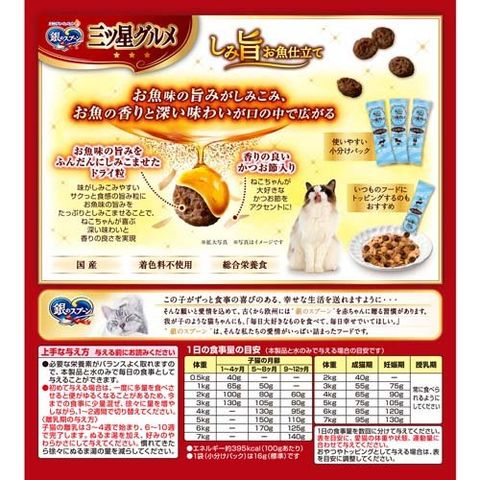 (授乳期)1日中、常に食べられるようにして与えてください。給与量を目安として、猫ちゃんの運動量や年齢等の状態に合わせて調整してください。