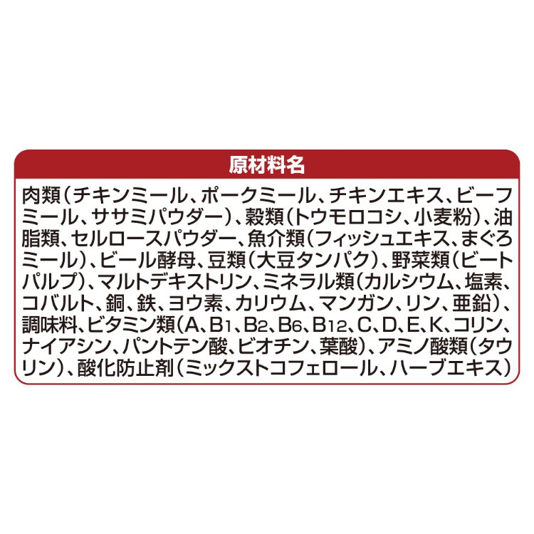 | 肉類(チキンミール、ポークミール、チキンエキス、ビーフミール、ササミパウダー)、穀類(トウモロコシ、小麦粉)、油脂類、セルロースパウダー、魚介類(フィッシュエキス、まぐろミール)、ビール酵母、豆類(大豆タンパク)、野菜類(ビートパルプ)、マルトデキストリン、ミネラル類(カルシウム、塩素、コバルト、銅、鉄、ヨウ素、カリウム、マンガン、リン、亜鉛)、調味料、ビタミン類(A、B1、B2、B6、B12、C、D、E、K、コリン、ナイアシン、パントテン酸、ビオチン、葉酸)、アミノ酸類(タウリン)、酸化防止剤(ミックストコフェロール、ハーブエキス) |