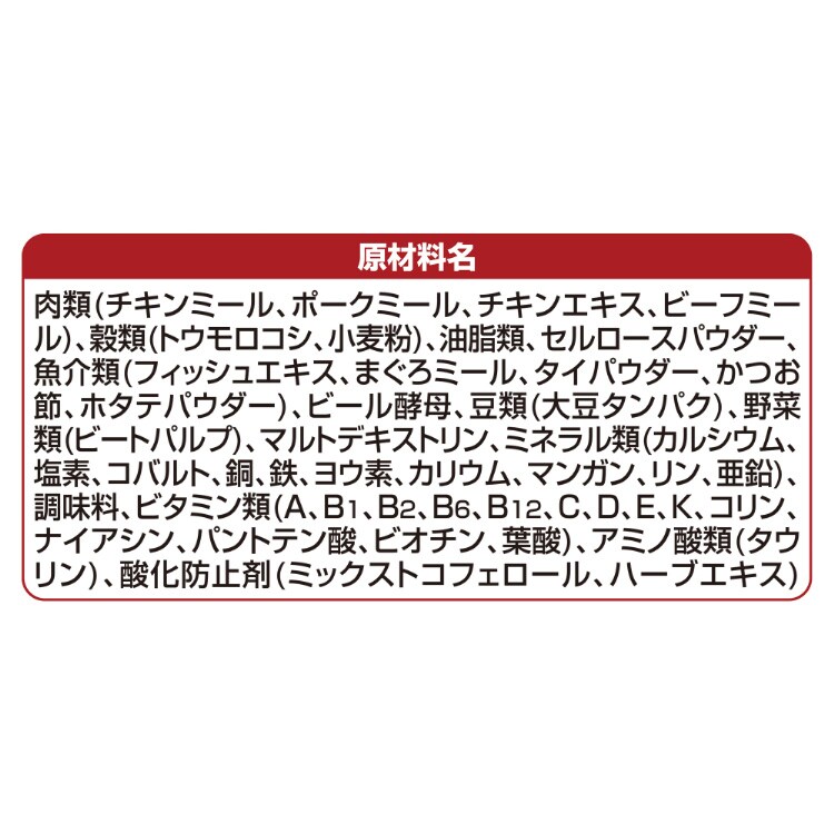 | 肉類(チキンミール、ポークミール、チキンエキス、ビーフミール)、穀類(トウモロコシ、小麦粉)、油脂類、セルロースパウダー、魚介類(フィッシュエキス、まぐろミール、タイパウダー、かつお節、ホタテパウダー)、ビール酵母、豆類(大豆タンパク)、野菜類(ビートパルプ)、マルトデキストリン、ミネラル類(カルシウム、塩素、コバルト、銅、鉄、ヨウ素、カリウム、マンガン、リン、亜鉛)、調味料、ビタミン類(A、B1、B2、B6、B12、C、D、E、K、コリン、ナイアシン、パントテン酸、ビオチン、葉酸)、アミノ酸類(タウリン)、酸化防止剤(ミックストコフェロール、ハーブエキス) |