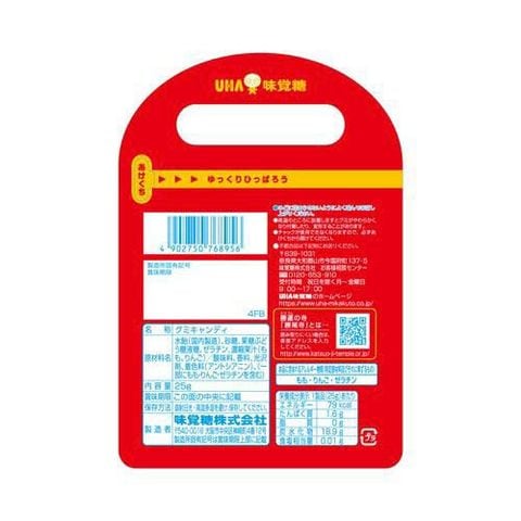 | 水飴(国内製造)、砂糖、果糖ぶどう糖液糖、ゼラチン、濃縮果汁(もも、りんご)/酸味料、香料、光沢剤、着色料(アントシアニン)、(一部にもも・りんご・ゼラチンを含み) |