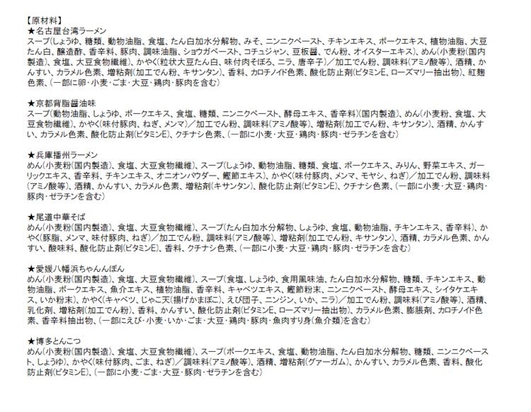 | ★名古屋台湾ラーメン 卵、小麦、ごま、大豆、鶏肉、豚肉 ★京都背脂醤油味 小麦、大豆、鶏肉、豚肉、ゼラチン ★兵庫播州ラーメン 小麦、大豆、鶏肉、豚肉、ゼラチン ★尾道中華そば 小麦、大豆、鶏肉、豚肉、ゼラチン ★愛媛八幡浜ちゃんんぽん えび、小麦、いか、ごま、大豆、鶏肉、豚肉、魚肉すり身(魚介類) ★博多とんこつ 小麦、ごま、大豆、豚肉、ゼラチン |